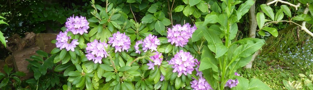 Anyway – to pleasanter thoughts. Everything is growing fast in the usual haphazard way, and the rhododendron is blooming again. (Five years, is it?) I shall be cutting back and pulling up ruthlessly, but at the moment there’s still room for everything. Even better: the weather is finally warm enough to make sitting outside a pleasure.