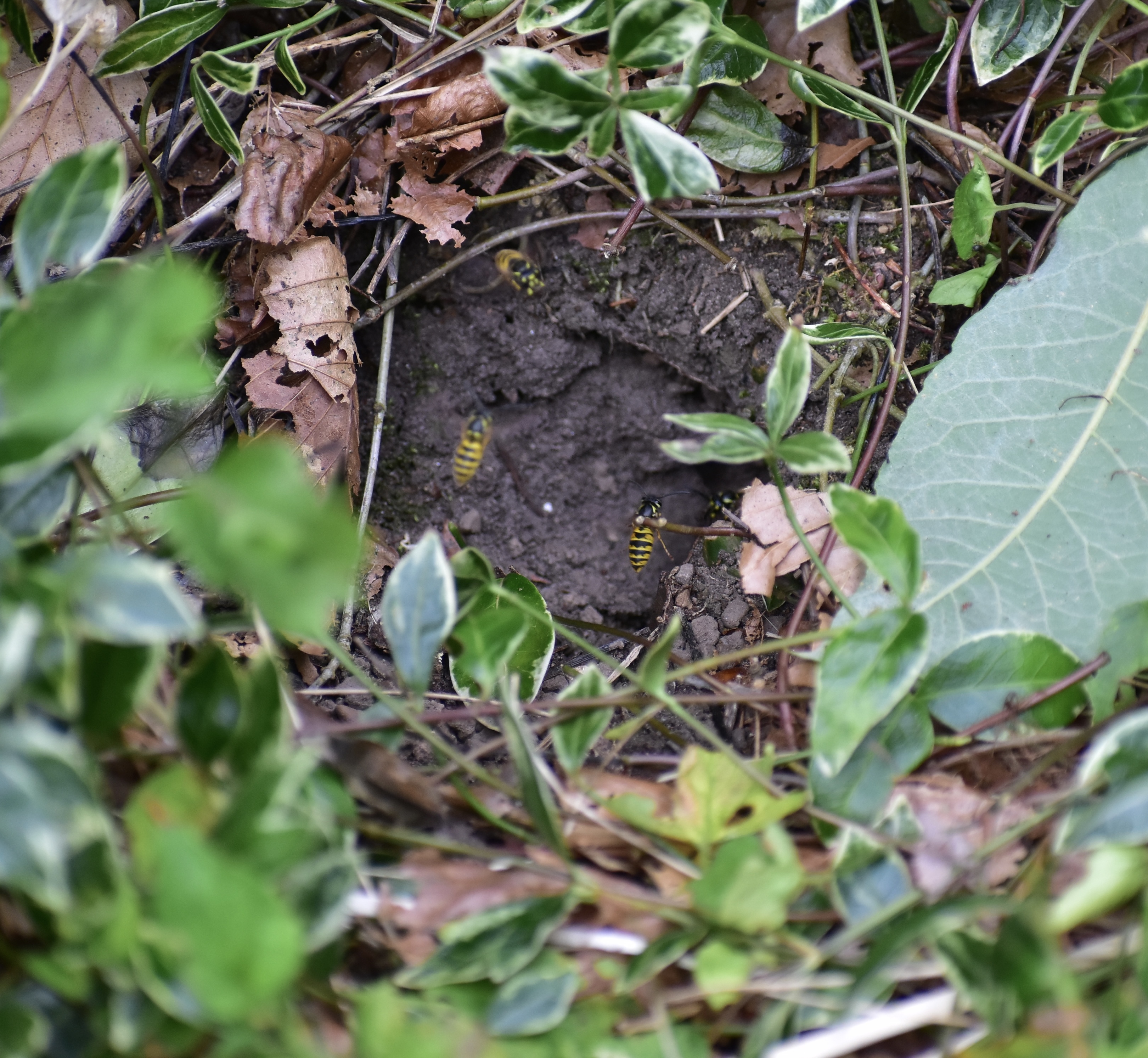 Doh. How wrong can I be? They were wasps! I am only glad that they were in too mellow a mood to mind. Now I have the dilemma: to eradicate or to live with them?