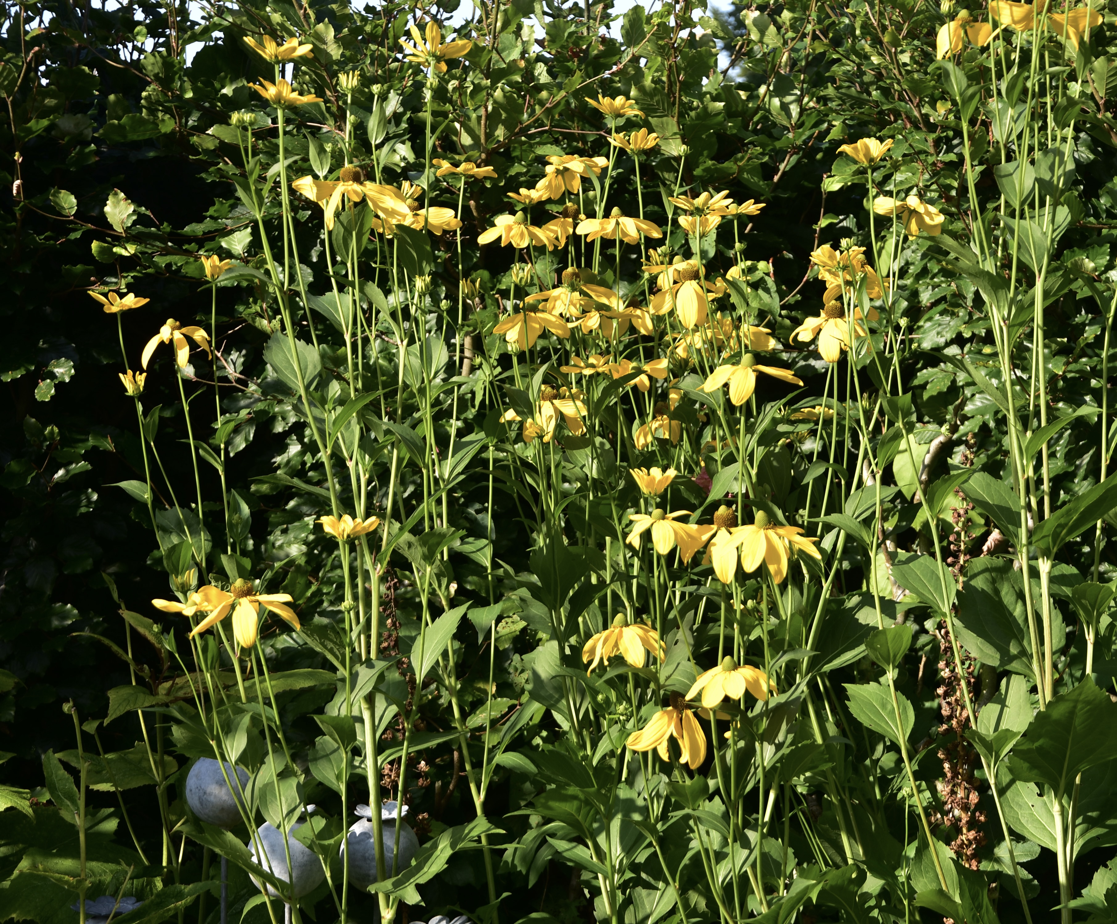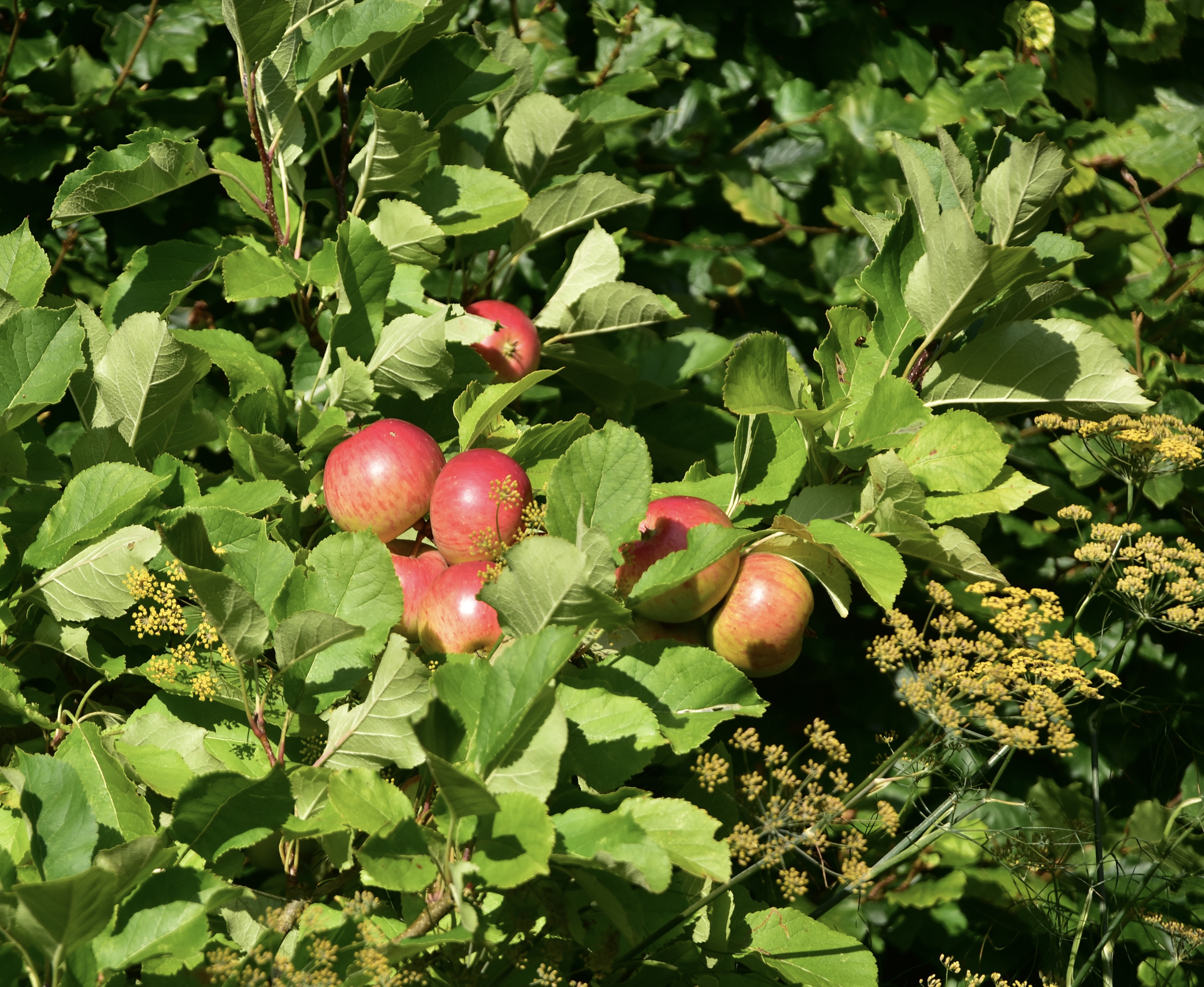 The garden is heading into its autumn phase: I’ve dealt with only some of the long grass; the jasmine, so fragrant a couple of weeks ago, now looks tatty; colour is provided by ripening apples and the over-leggy rudbeckias; cyclamen are peeping through. There’s a fair bit to do, but the weather is unpropitious and both green bins are full to bursting until next bin day. The tattiness lives for another week.