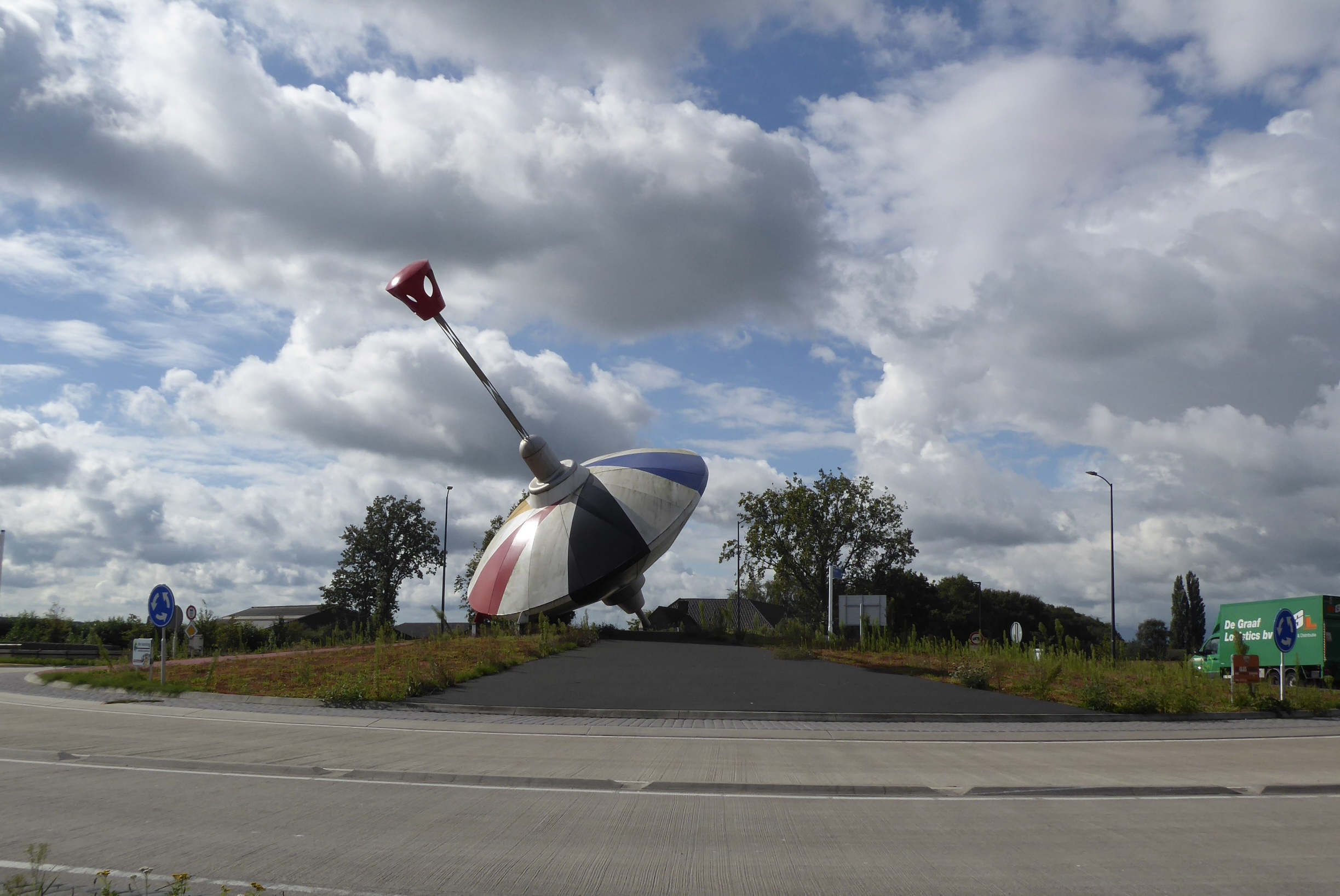 I noticed that there was also a Hooge Zwaluwe nearby – so I deduce they are “Lower” and “Upper” Zwaluwe. A less ferocious tailwind (boo!) but drier and sunnier (hurray!) than yesterday. The first part of the day was along the river on a high path dodging gangs of nonchalant sheep. Then through Oosterhout (great roundabout) and Dongen to the Wilhelminakanaal, which enabled us to skirt Tilburg without needing to navigate. It also gave us a very different impression of Dutch cycling: no longer gentle pootling but – now that e-bikes are so common and so various – more like a speedway circuit. The cycle paths are being upgraded; I was tempted to compare it to dualling the A1 or adding an extra lane to the M25.