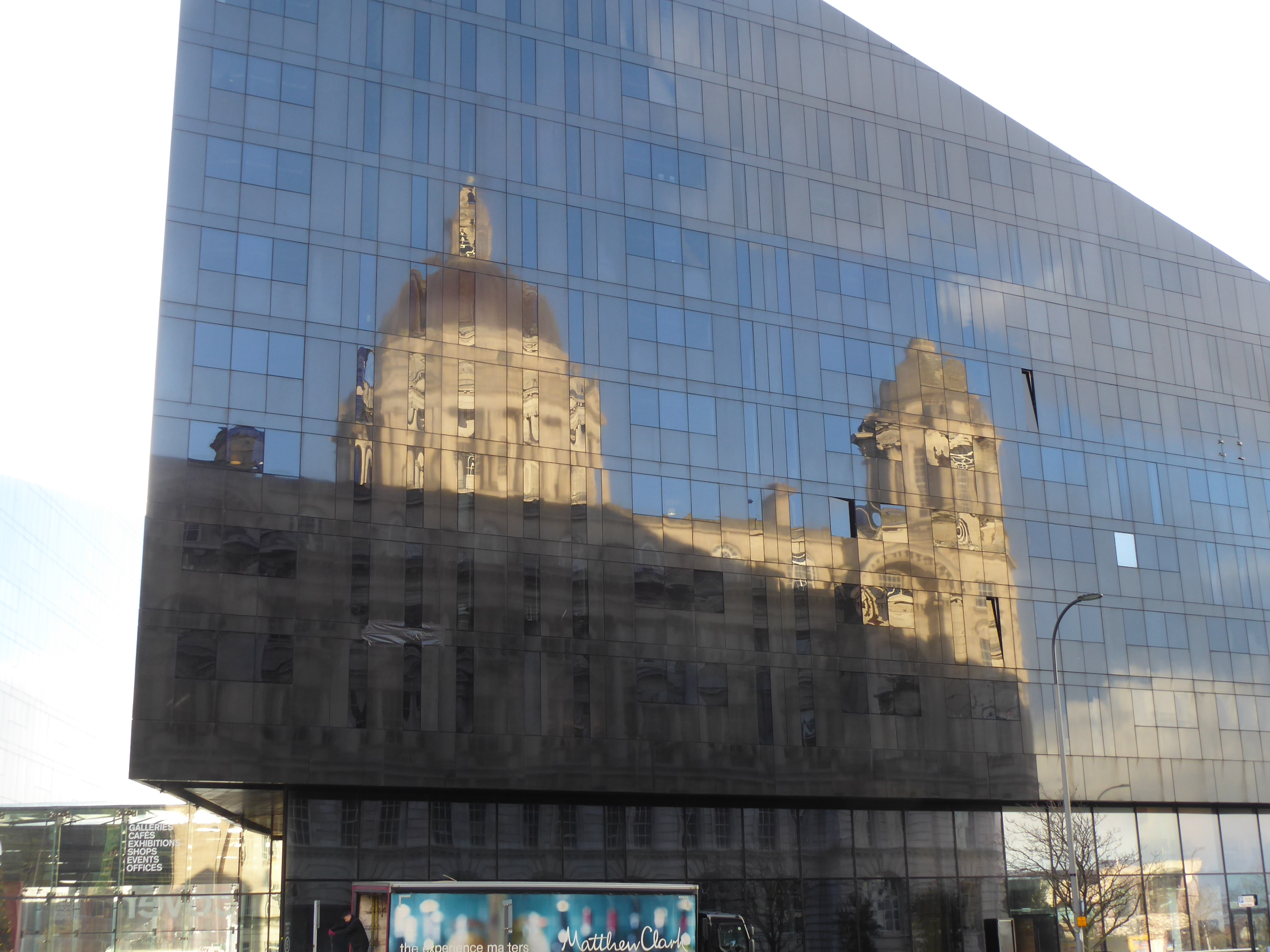 The Mersey wind cuts with a sharp knife: I tucked everything around me as I headed down to the river. The open views of the famous riverside buildings have been redacted by the big blots of modern buildings – but the latter do provide good reflections. Having watched Terence Davies’s “Of Time and the City” a couple of weeks ago, I remembered the overhead railway, and reflected that the waterfront has probably never presented a perfect view. (But the Cunard Building tried hard!)