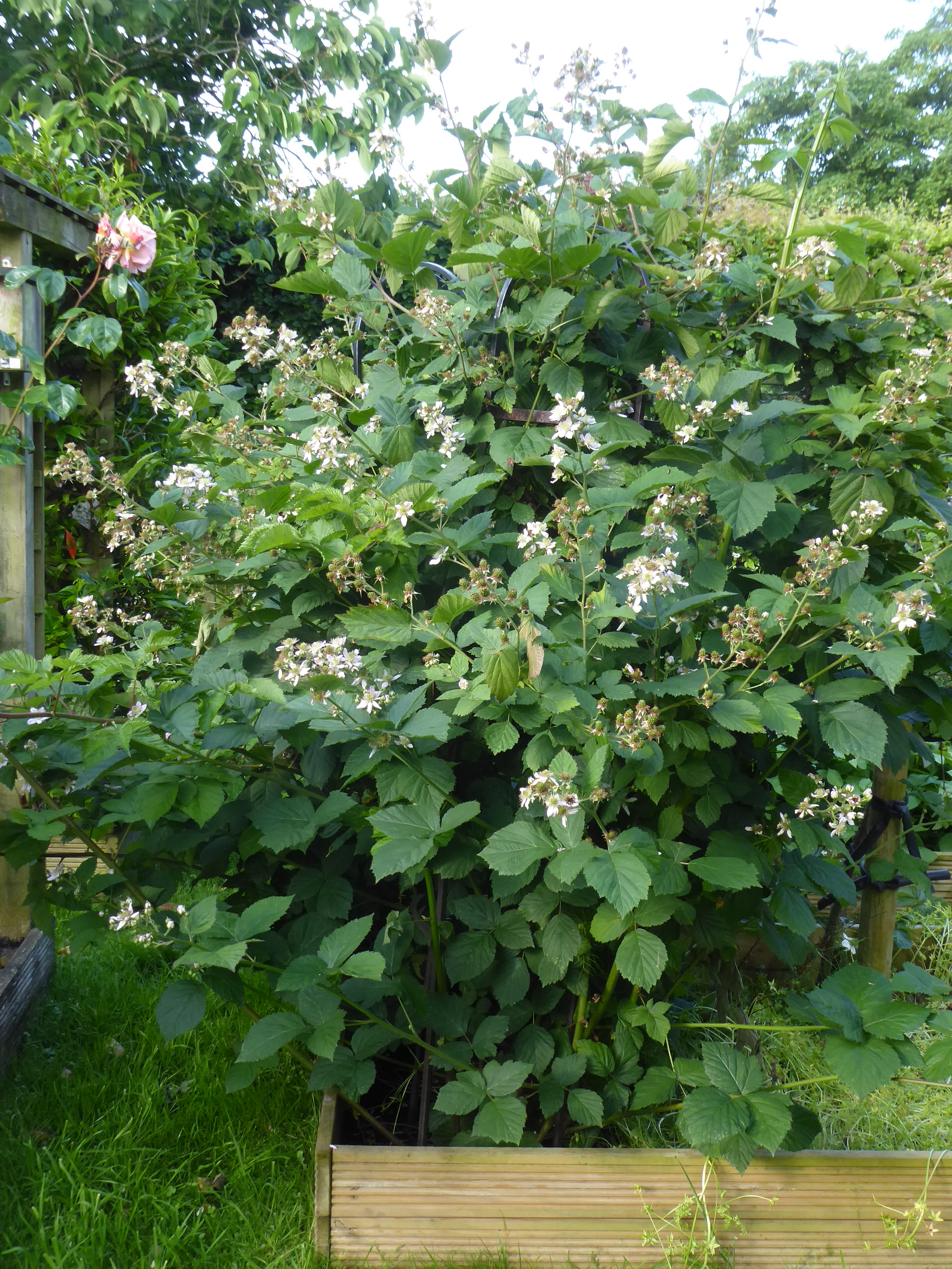 It’s looking OK. The vegetables are generally thriving (but tree roots spread everywhere, taking advantage of the nutrients I add in the raised beds), the dead patch on the grass is slowly growing over, the blackberry plants are monstrous – oh, the usual mixture of “how lovely” and “sigh”.