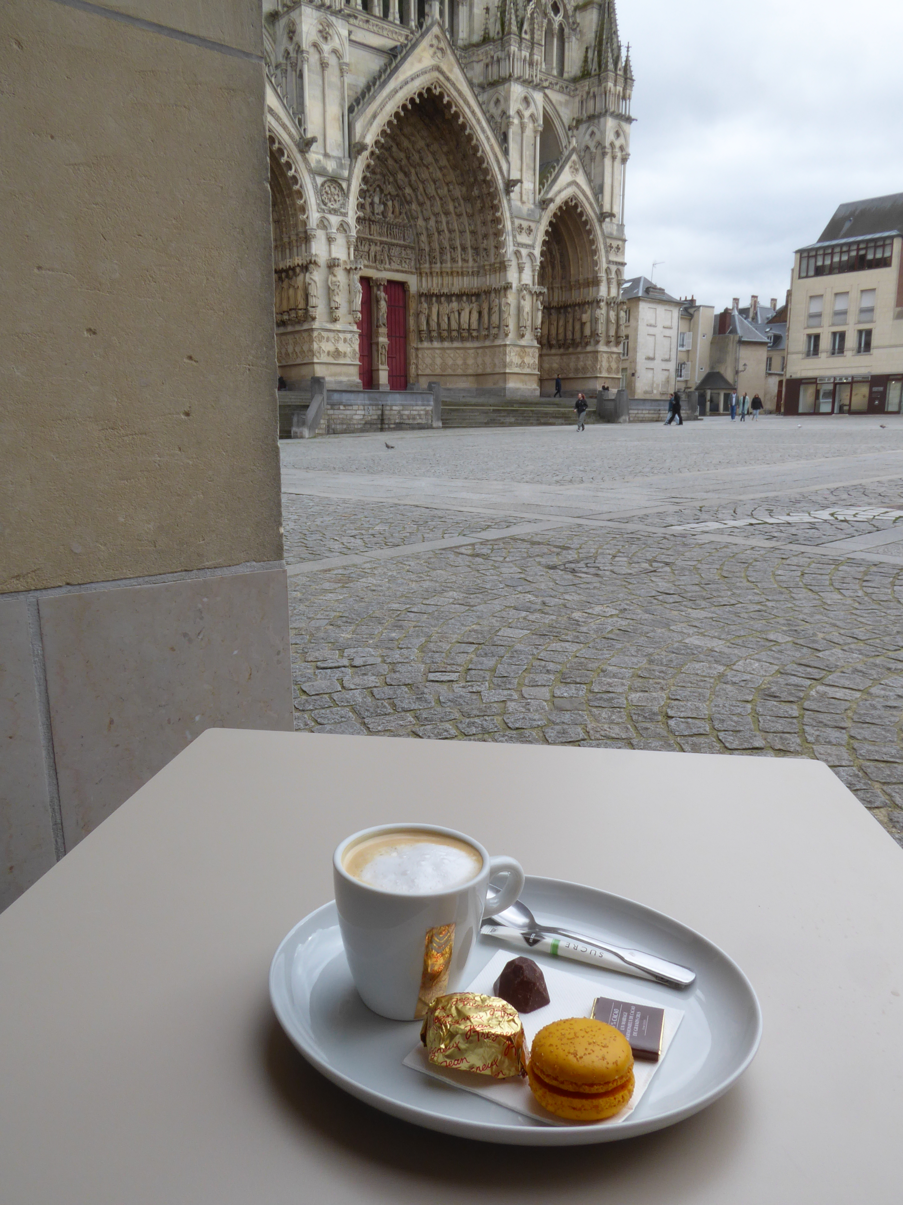 Anyway, at some point – possibly when I dredged up some French (and my accent sounds oddly atrocious even to my ears) – I finally felt that I had entered a different world. Part of the difference is not being able to have what I am used to: a washed-out café crème rather than an americano , or uncertainty over finding a non-meat food option. I do not ask for sympathy: I pimped my café crème by asking for the “café gourmand” option: a macaron, macaroon, chocolate and a view of the cathedral.