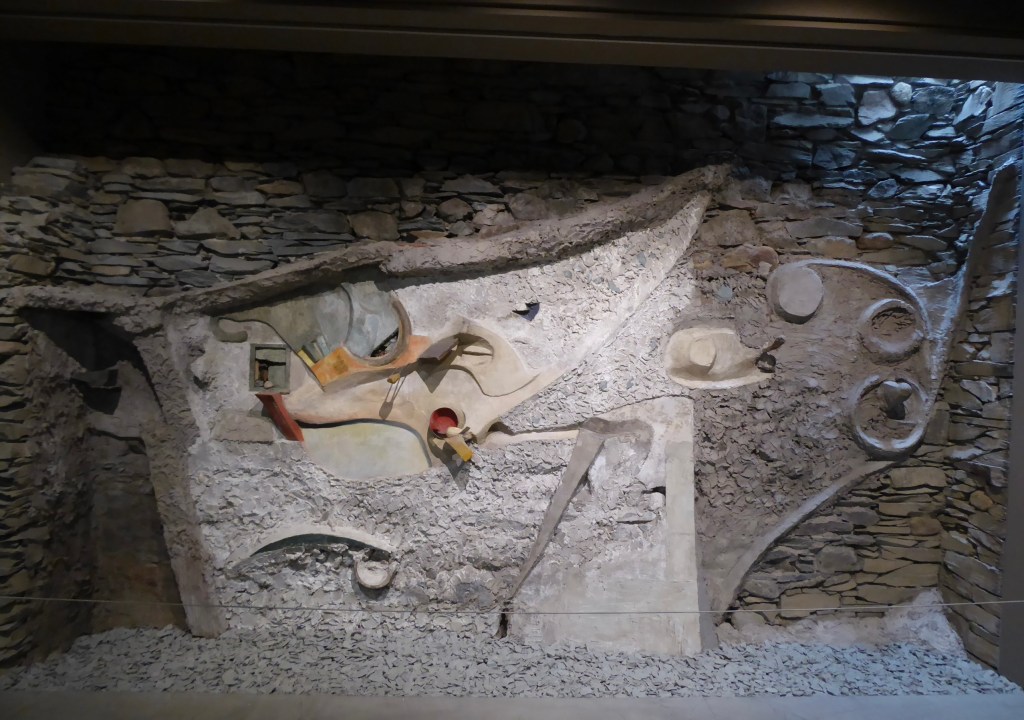 Yes – but without that sense of astonishment I had the first time. The lines and shapes and proportions seem just right somehow. The clean curves offset by the texture of the plaster “scales”. The little areas of colour. I knew it was unfinished, but I didn’t realise- until I read further – that this is not quite what Schwitters created. There were other elements, like a column, but this (restored) is all that remains.