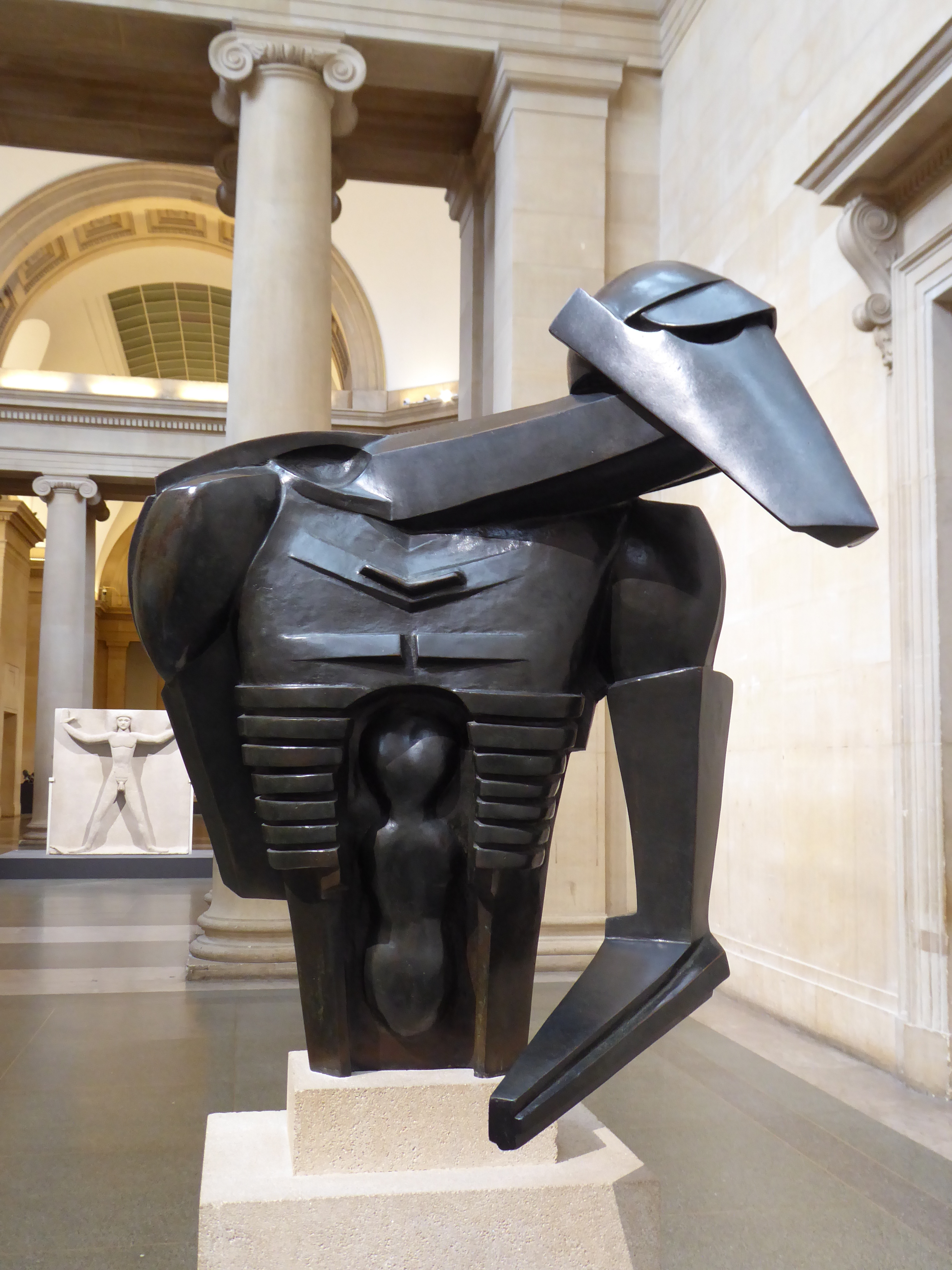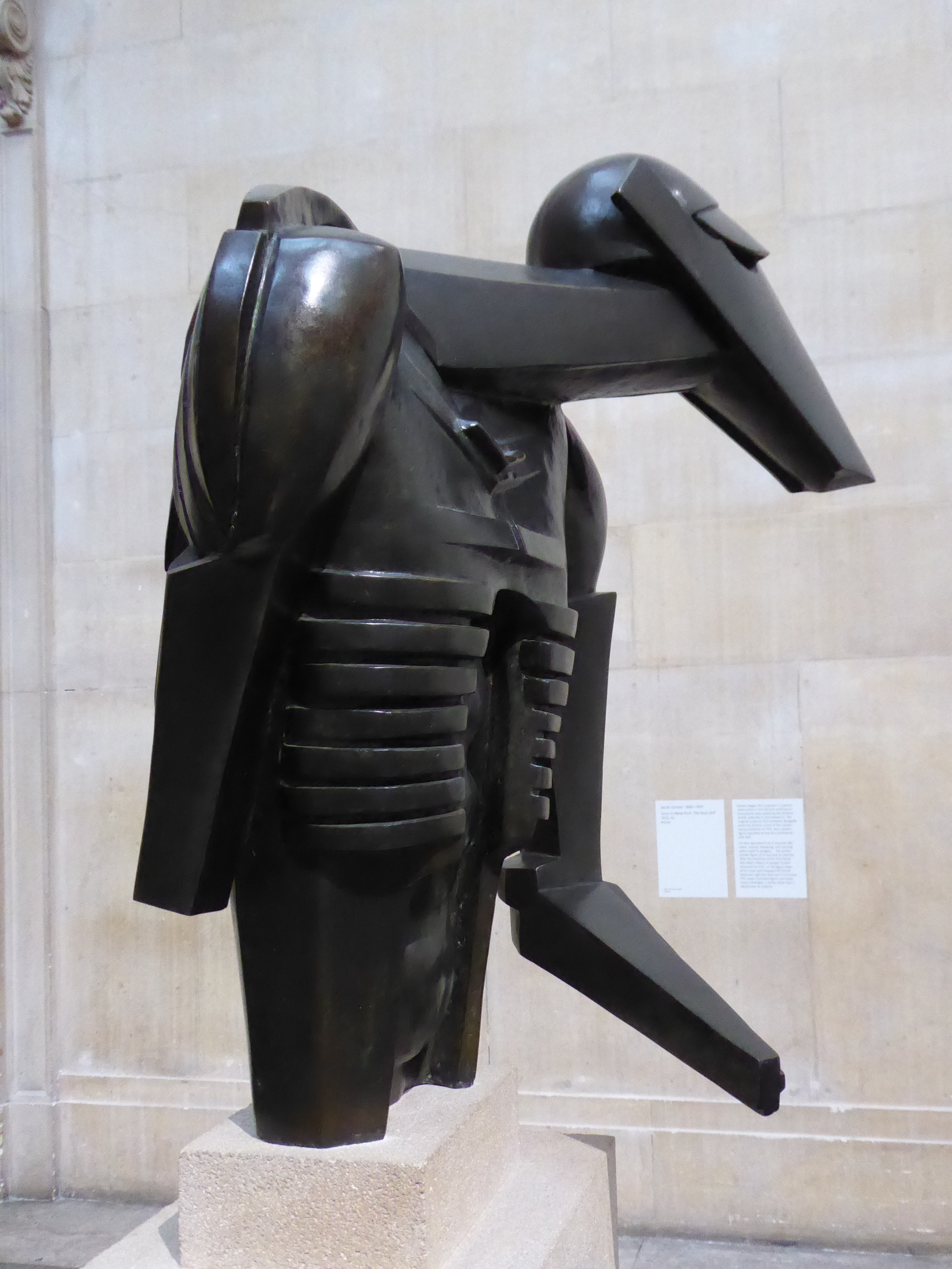 I wandered around the regular galleries too, and noted a painting of Mrs Mounter by Harold Gilman that I was sure I had seen last month at the Walker. Yes, I had – Mrs Mounter was a regular model for Gilman; I’ve even seen her in Leeds. The main hall had a selection of Jacob Epstein’s sculptures, and I was struck anew by the Rock Drill torso. Epstein changed the sculpture (originally more sinister) after WWI, amputating some of it and casting it in bronze, and the result is somehow sorrowful – almost like a Pietà with bowed head and arm reaching out in supplication.